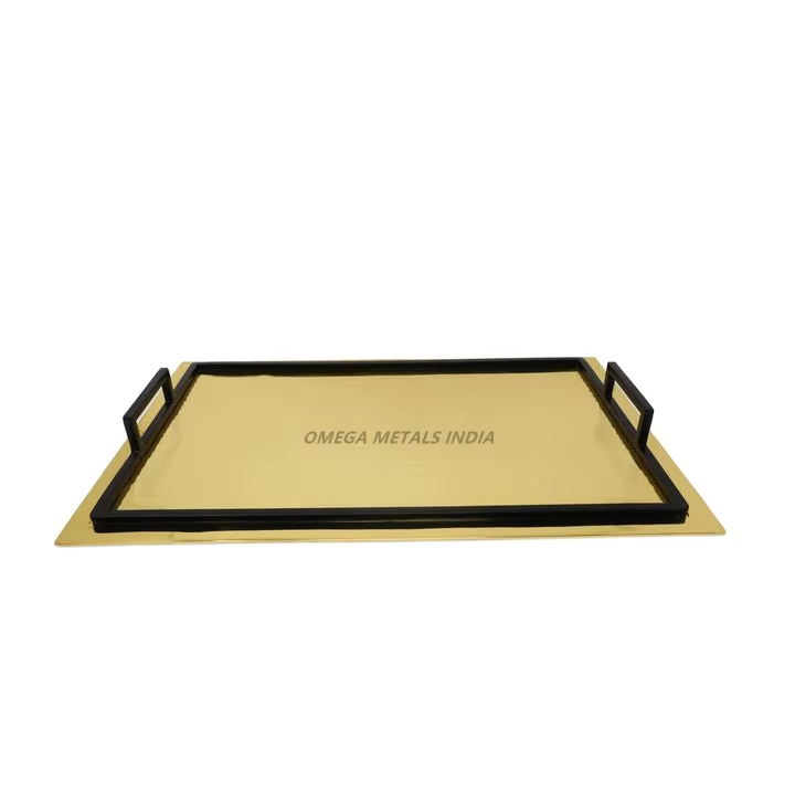 ถาดเสิร์ฟสีทองทรงสี่เหลี่ยมพร้อมที่จับโลหะสีดำเพื่อความบันเทิงและการนำเสนอที่บ้านอย่างมีสไตล์
