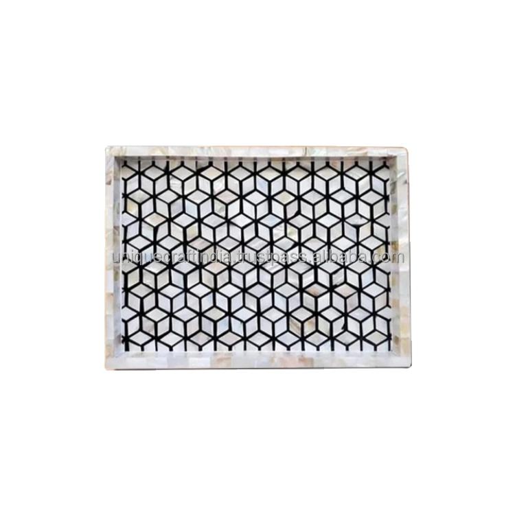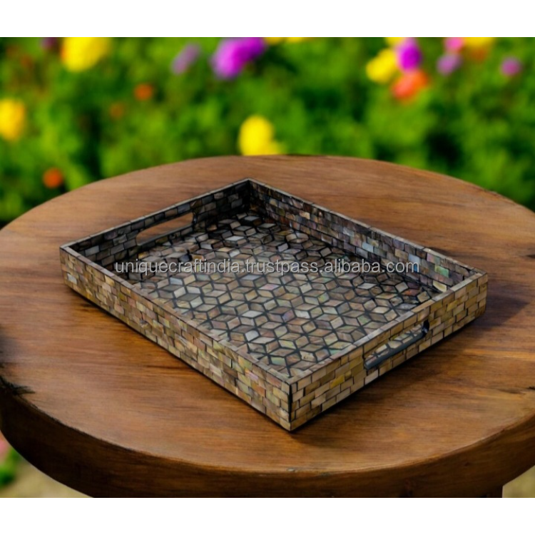 ถาดไม้แบบฝังไม้ถูพื้นทรงสี่เหลี่ยมผืนผ้าพร้อมที่จับด้านข้างถาดไม้แฮนด์เมดสำหรับบริการชาของตกแต่งห้องครัวใช้ในบ้านของขวัญ
