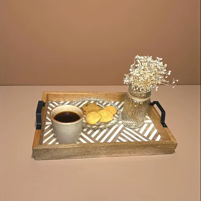 ถาดไม้ทรงสี่เหลี่ยมผืนผ้า ดีไซน์หรูหรา พร้อมหูจับโลหะ สำหรับใช้ในบ้านและสำนักงาน ให้ลุคธรรมชาติสวยงามและทนทาน