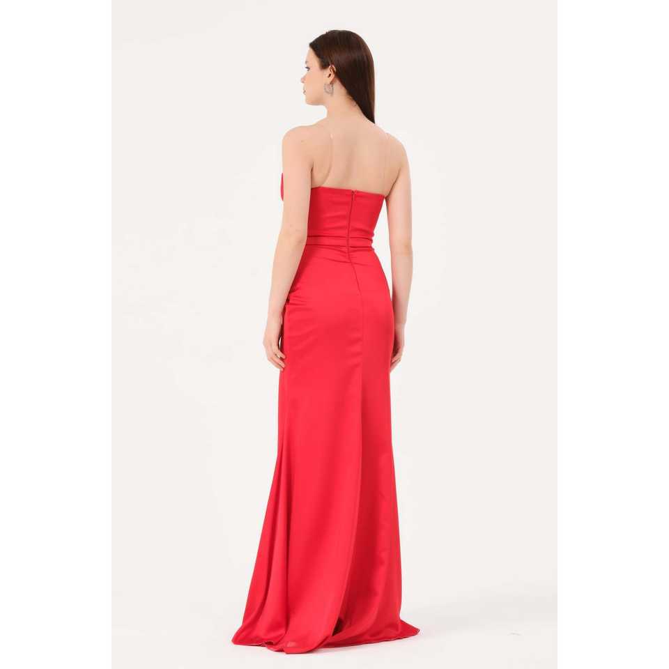 ชุดเพื่อนเจ้าสาวสีแดงสุดหรู คอรูปหัวใจ สายเดี่ยว ทรงเข้ารูป ผ่าสูง เอวธรรมชาติ ชุดยาว