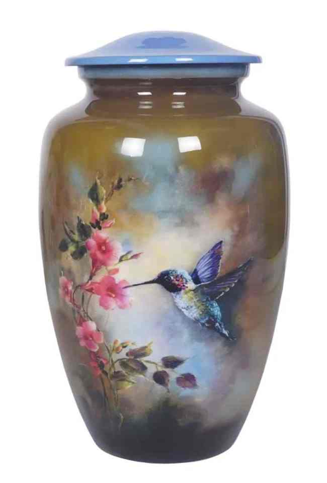 โกศบรรจุอัฐิรูปนกฮัมมิงเบิร์ดสีแดงและดอกไอริสสุดหรู พร้อมถุงกำมะหยี่สำหรับบรรจุอัฐิผู้ใหญ่