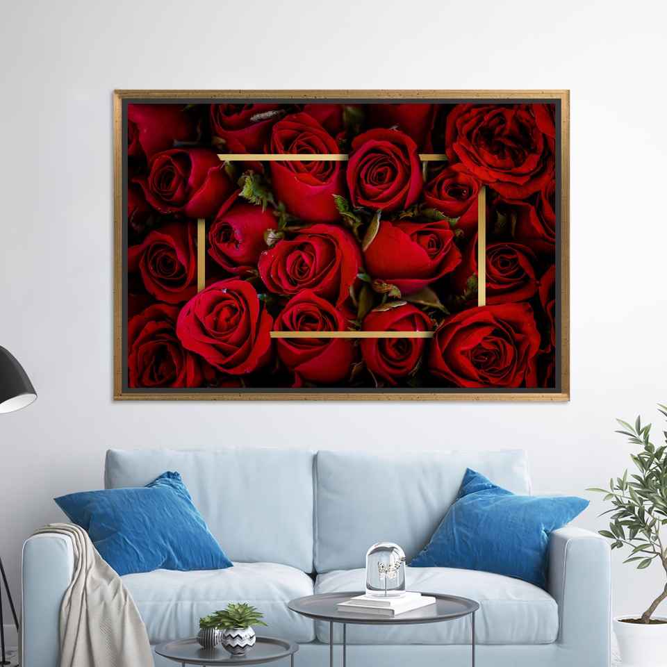 ผ้าใบพิมพ์ลายกุหลาบแดงสุดหรู - งานศิลปะติดผนังลายดอกไม้สุดหรู พร้อมกรอบสีทอง