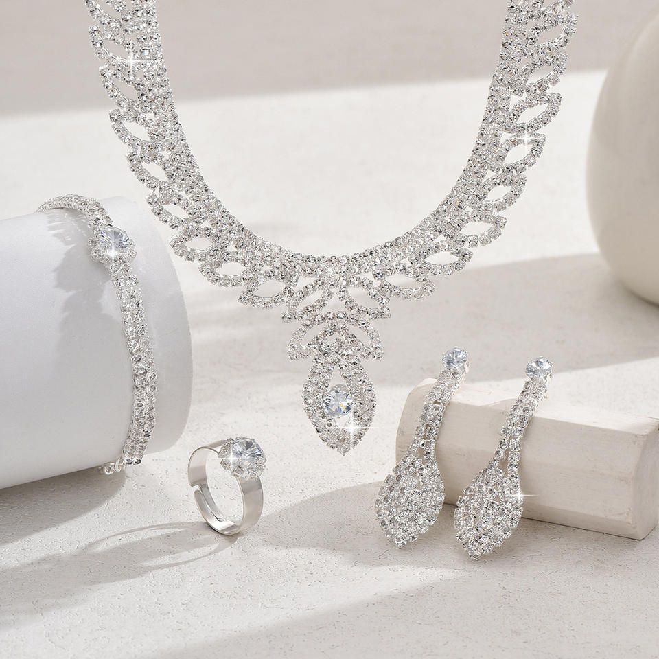 ชุดสร้อยคอและต่างหูเจ้าสาวประดับคริสตัลหรูหราโรแมนติก ชุบเงิน ขายส่ง เครื่องประดับงานแต่งงานสไตล์ยุโรปและอเมริกา