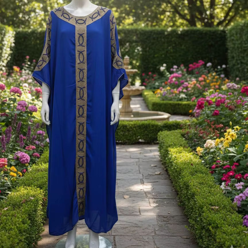 Elegant Royal Blue Embroidered Kaftan A Timeless Fusion of Luxury Intricate Gold Craftsmanship & Graceful Garden Sophistication