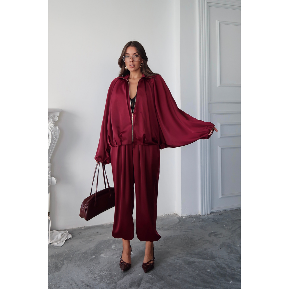 กางเกงฮาเร็มผ้าซาตินสีแดงเบอร์กันดีทรงสวยหรูสำหรับผู้หญิง กางเกงขากว้างเนื้อผ้านุ่มพลิ้วใส่สบายสไตล์ลำลองแฟชั่น