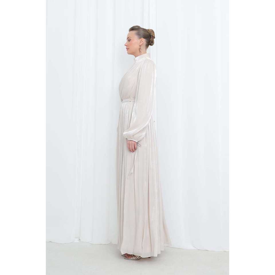 ชุดราตรีทรงเอไลน์ผ้าซาตินจับจีบแขนยาวคอสูง ดีไซน์ผูกโบว์และผ้าพันรอบตัว เหมาะสำหรับผู้หญิงที่สวมฮิญาบยุคใหม่