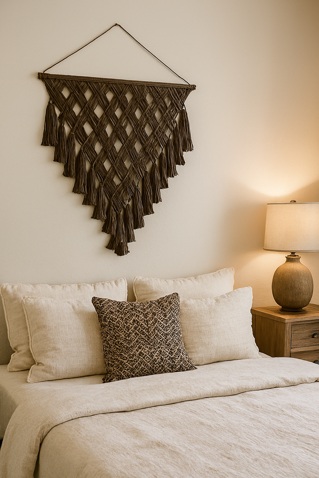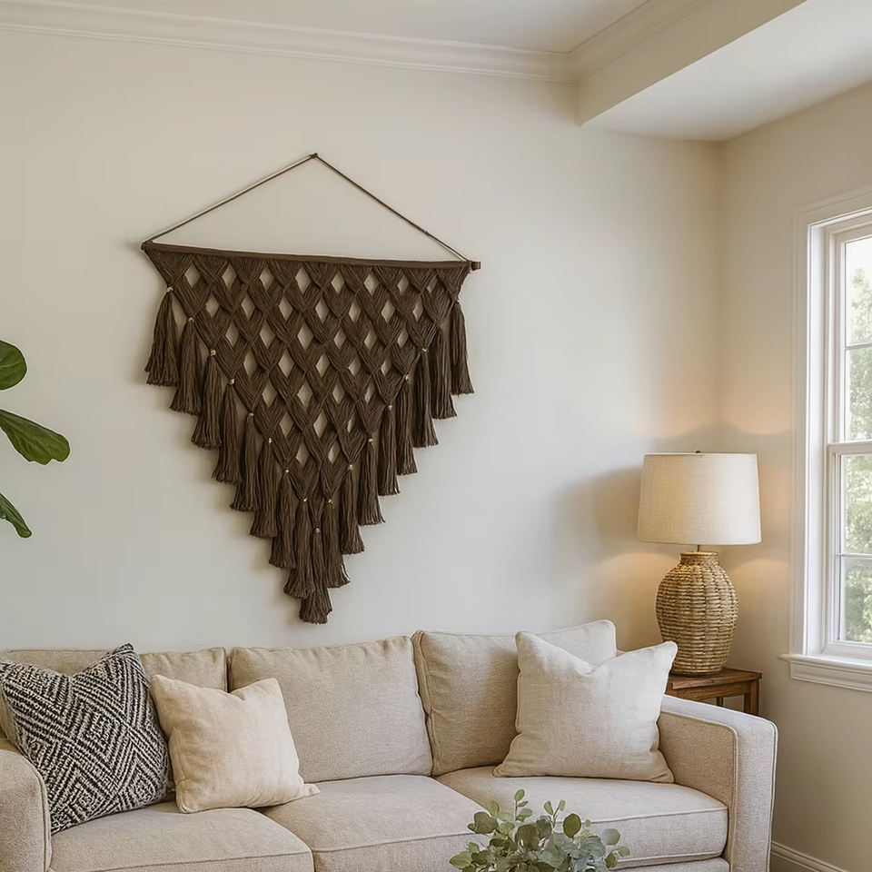 การออกแบบศิลปะติดผนัง macrame ผ้าฝ้ายสแกนดิเนเวียนที่สง่างามสำหรับการตกแต่งและการตกแต่งภายในบ้าน