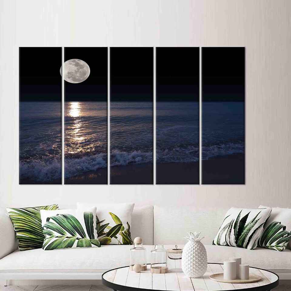 วิวทะเลและดวงจันทร์ที่สวยงามพิมพ์ผ้าใบสำหรับตกแต่งบ้านร่วมสมัย5P: แกลเลอรีห่อ