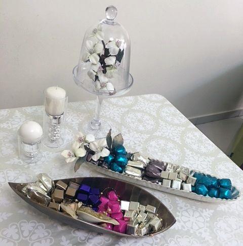 ถาดตกแต่งรูปเรือสีเงินสุดหรู พร้อมช็อกโกแลตห่อสีสันสดใสหลากหลายชนิด ของขวัญสุดหรูสำหรับงานแต่งงาน อีด และรอมฎอน
