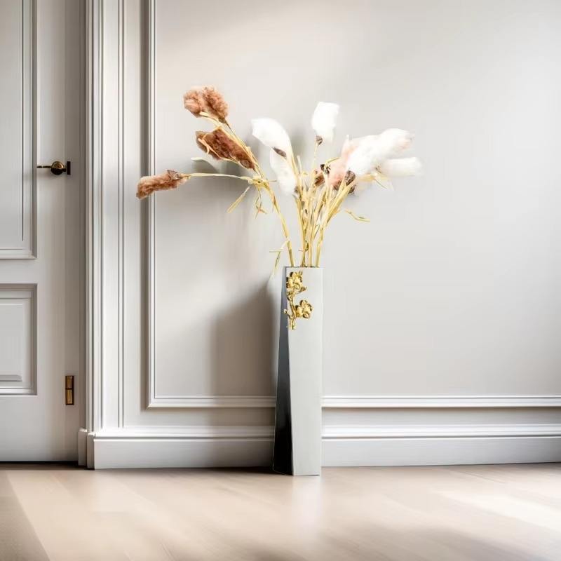 แจกันโลหะยาวสีเงินสุดหรูที่มีดีไซน์ดอกไม้สีทองที่สลับซับซ้อนสำหรับการตกแต่งบ้านที่หรูหรากลางและการจัดแสดงเหตุการณ์