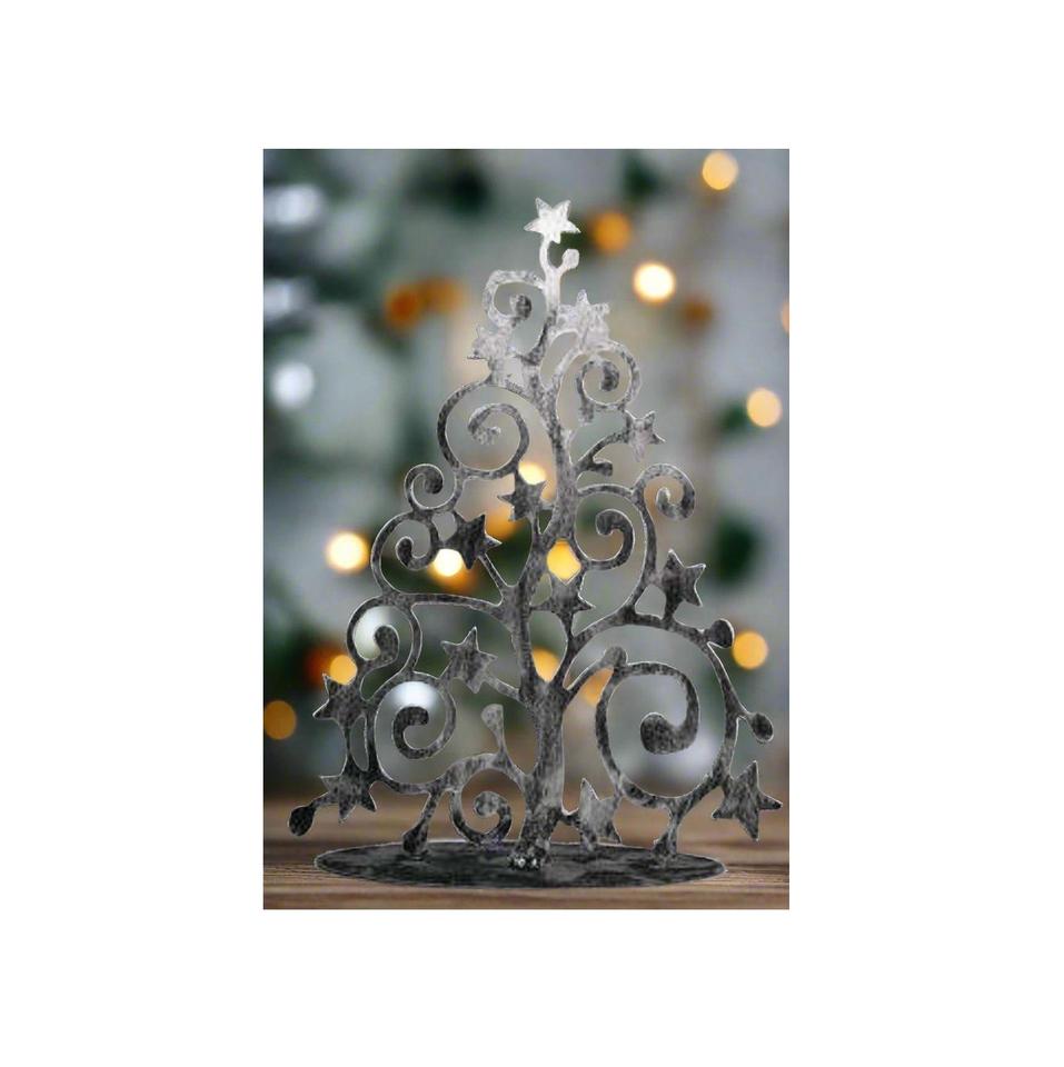 ต้นคริสต์มาสอะลูมิเนียมสีเงินทันสมัย ดีไซน์หรูหรา ผลิตด้วยมือ พร้อมฐานสร้างสรรค์และดาวประดับด้านบน