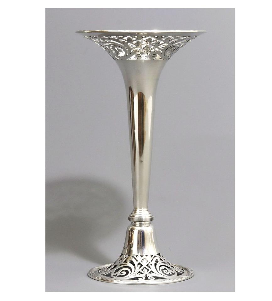 แจกันทรงทรัมเป็ตทรงสูง ชุบเงิน ดีไซน์หรูหรา ขอบหยัก ผิวสัมผัสแบบตอกลาย เหมาะสำหรับตกแต่งพื้น แจกันอะลูมิเนียมขนาดใหญ่ สไตล์โมเดิร์น ขาย