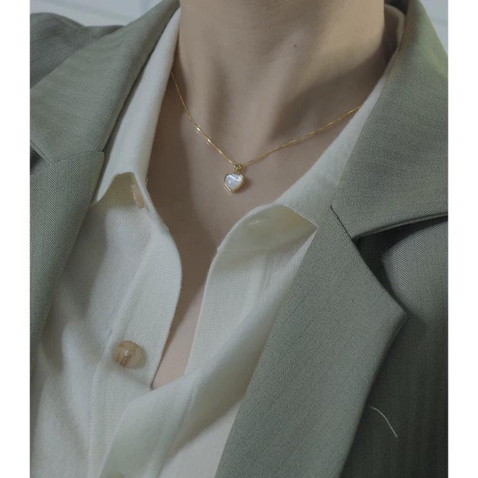 สร้อยคอทอง 14K ดีไซน์เรียบหรู รูปผีเสื้อประดับเปลือกหอย พร้อมจี้รูปหัวใจสีพีช สายคล้องคอสีขาว ประดับมุก