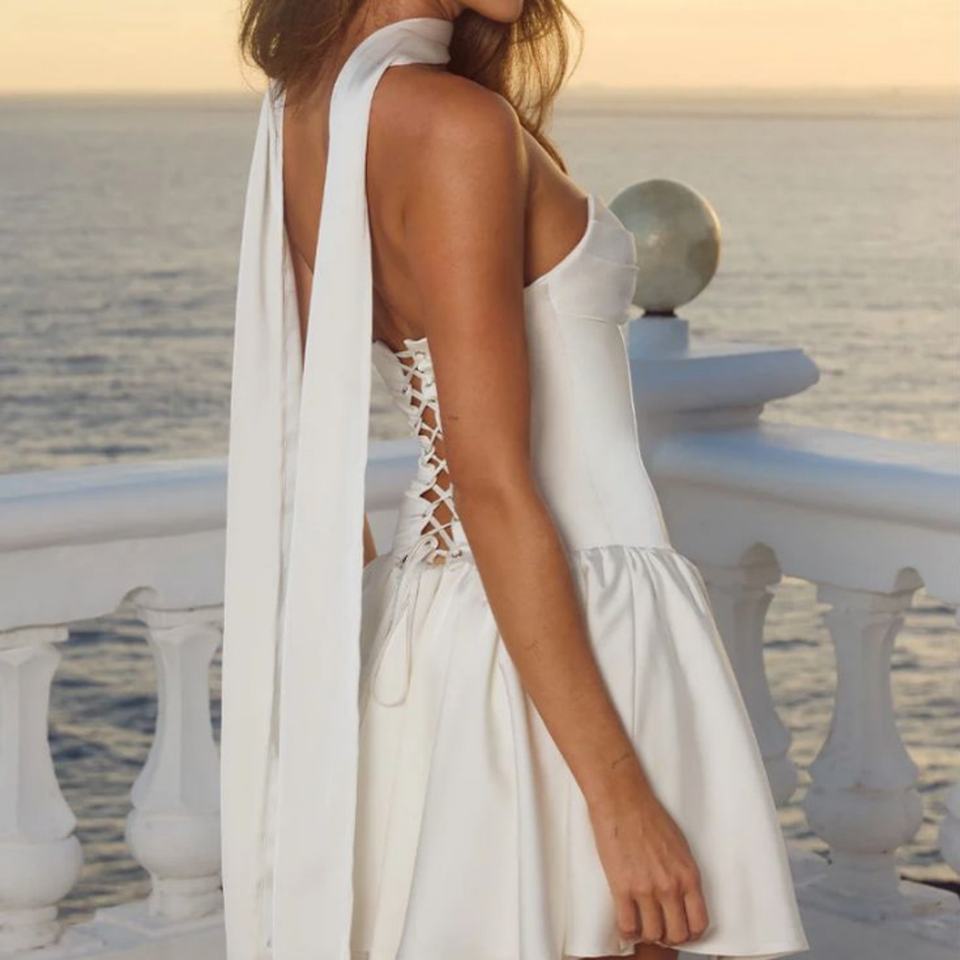 เดรสสีพื้นเรียบหรูสำหรับผู้หญิง รุ่นใหม่ประจำฤดูร้อนปี 2026 กระโปรงมินิทรงเอวสูงจีบระบาย สายเดี่ยว เหมาะสำหรับงานปาร์ตี้และงานค็อกเทล