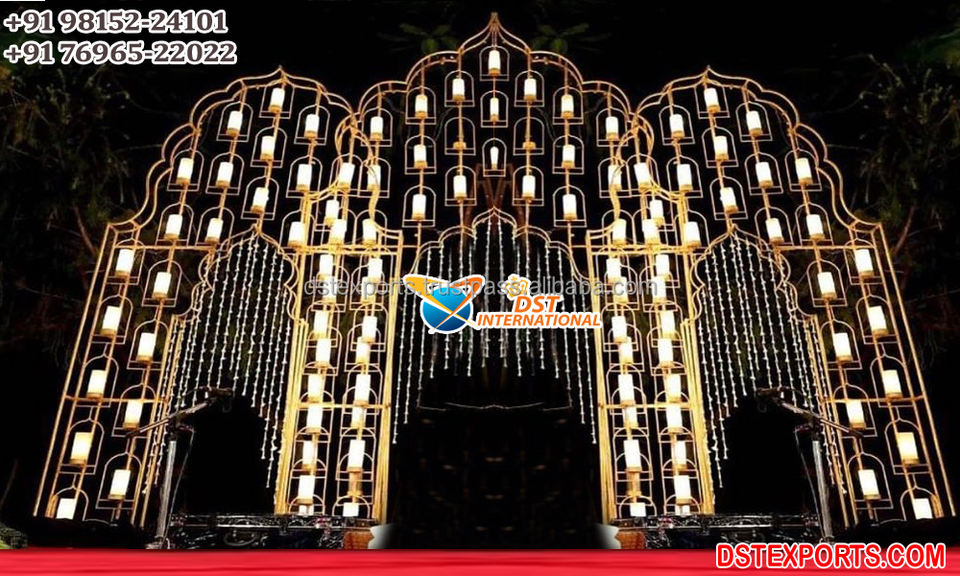 แผงเลเซอร์สำหรับฉากหลังเวทีที่หรูหราและผนังเทียนโลหะ Mehrab เทียนผนังสำหรับงานแต่งงานเชิงเทียนโลหะสีทอง
