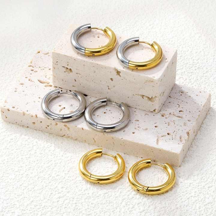 ต่างหูห่วงวงกลมหนาสองสี ดีไซน์ทันสมัย กันน้ำ ผลิตจากสแตนเลสชุบทอง 18K ขายส่งจำนวนมาก