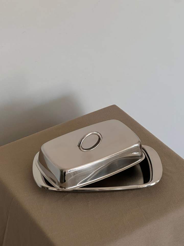 กล่องใส่เนยสแตนเลสสตีลหรูหราพร้อมฝาปิด สำหรับจัดเก็บบนเคาน์เตอร์ครัวและเสิร์ฟบนโต๊ะอาหารสไตล์โมเดิร์น