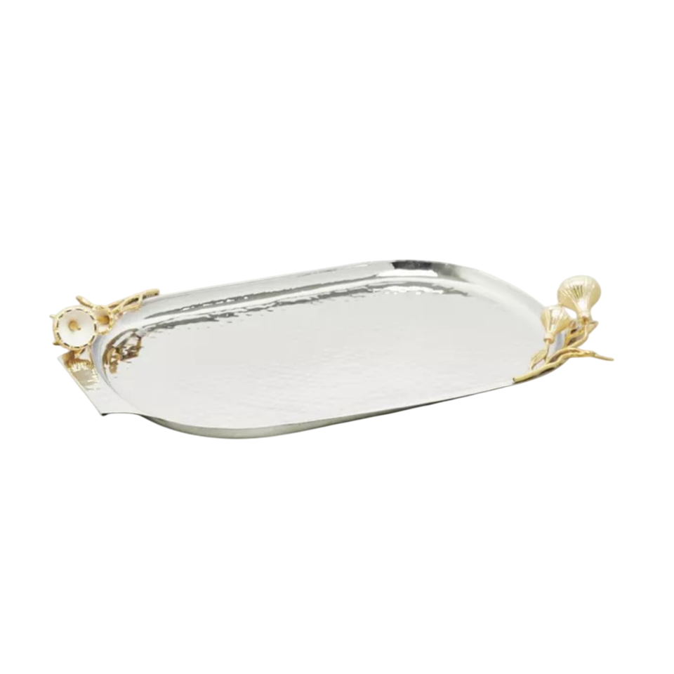 ถาดเสิร์ฟทรงไข่ค้อนทำจากสแตนเลสสตีลด้ามจับดอกบัวทองตกแต่งบ้านได้อย่างสมบูรณ์แบบ