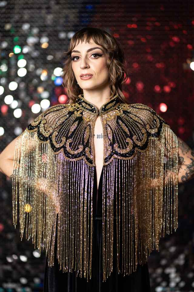 ชุดคลับยาวคลุมพื้นแบบตรงสไตล์เบอร์เลสก์ ประดับด้วยงานปักเลื่อมและลูกปัด พร้อมบราในตัว เหมาะสำหรับงานเฉลิมฉลอง