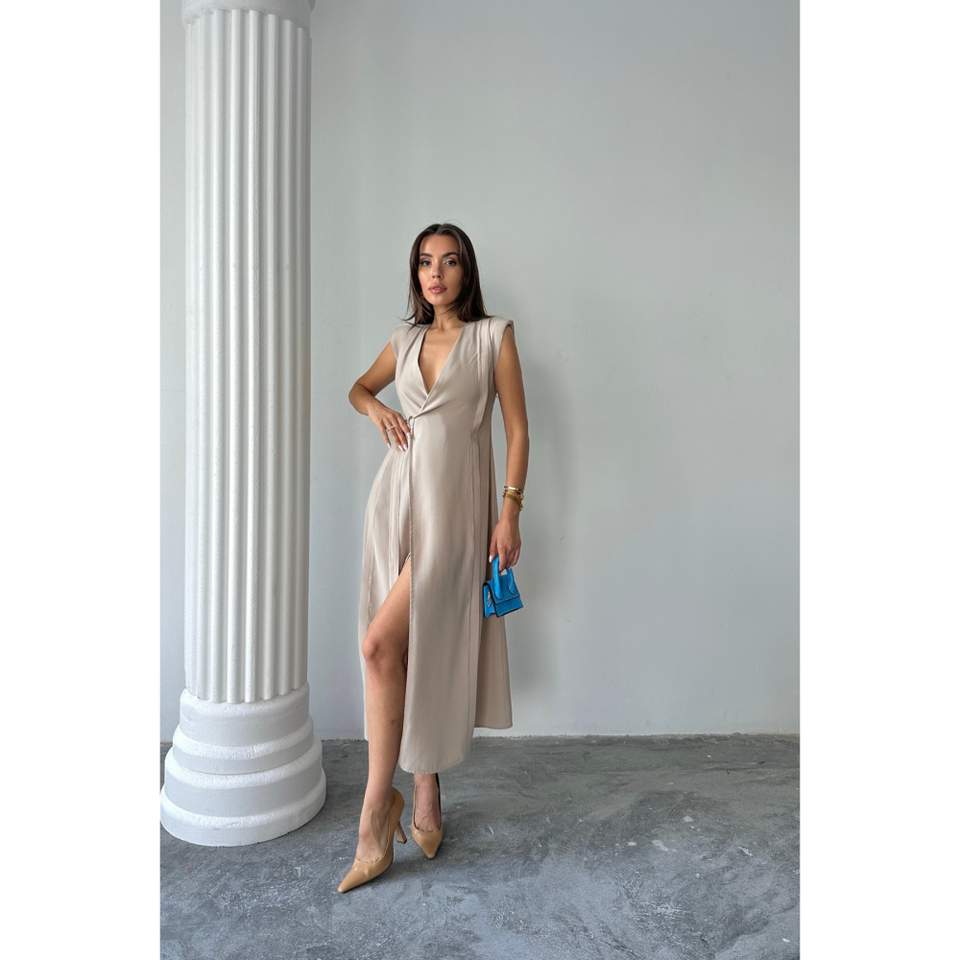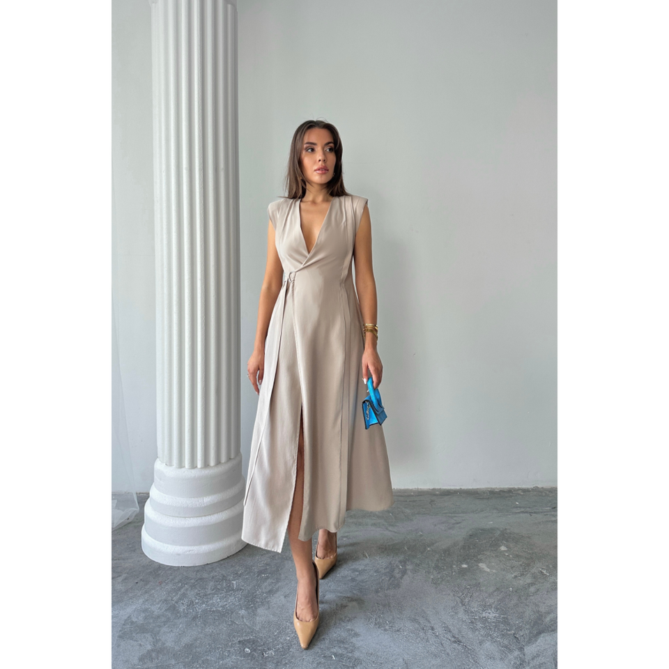 เดรสผ้าโมดอลสีเบจแบบไร้สายคล้องไหล่ ดีไซน์โปร่งแสง สไตล์หวาน แบบพันรอบตัว มีฟองน้ำเสริมทรง แขนกุด ทรงเว้า เหมาะสำหรับใส่ไปเที่ยวกลางวัน