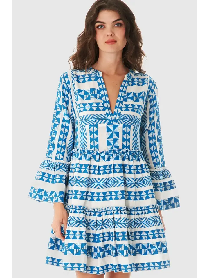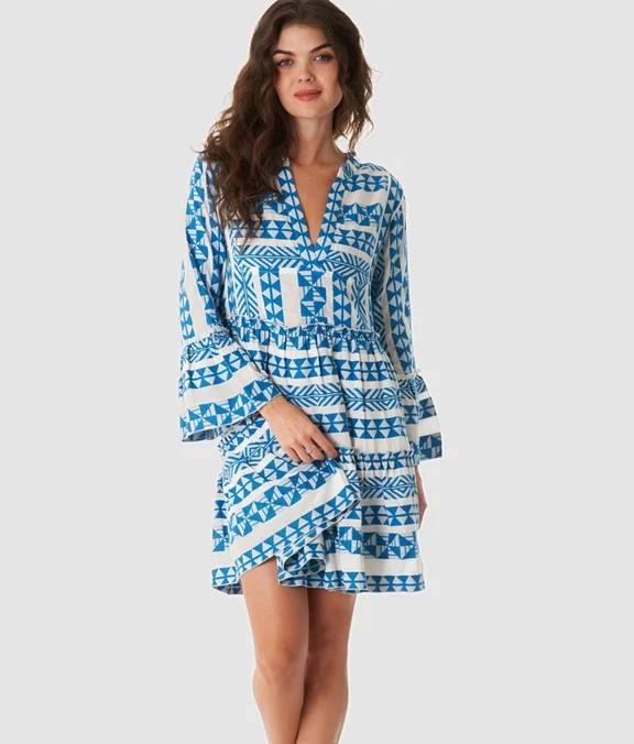 ชุดเดรสสั้นสำหรับผู้หญิงคอวีแขนยาวผ้าทอคอวีแขนยาวสำหรับฤดูร้อน