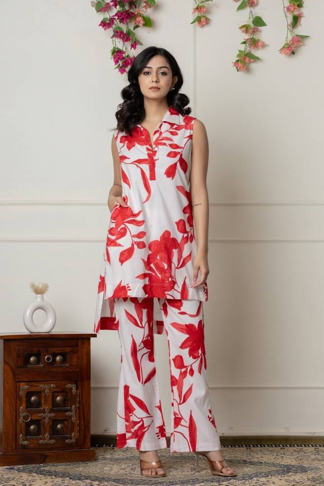 คอลเลคชั่นฤดูร้อนสุดหรู สีแดงขาว ผ้าฝ้ายเนื้อแน่น เป็นมิตรกับสิ่งแวดล้อม สไตล์วินเทจลำลอง ชุดเซ็ตเสื้อคอวีแบบคอร์ดูร์ แขนกุด