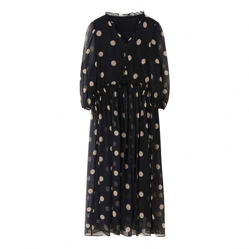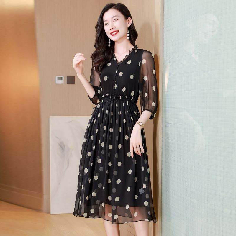ชุดเดรสผ้าไหมสำหรับผู้หญิงพิมพ์ลายใหม่พร้อมลูกไม้ตกแต่งรูปเอวเข้ารูปสำหรับฤดูร้อน