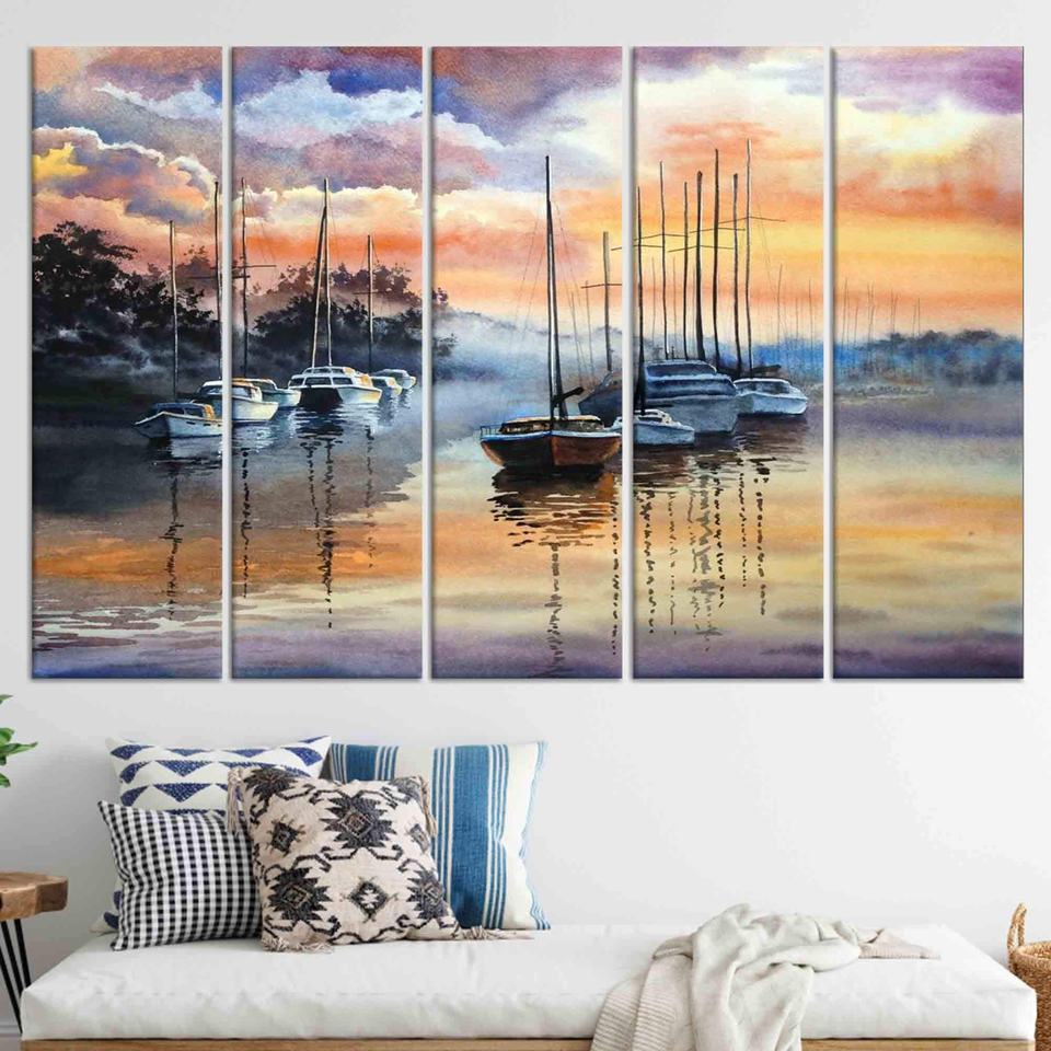 เรือใบยามพระอาทิตย์ตกที่งดงาม: ภาพพิมพ์บนผ้าใบลายทิวทัศน์ทะเลแบบนามธรรมริมชายฝั่ง ชุดผ้าใบ 5 ชิ้น