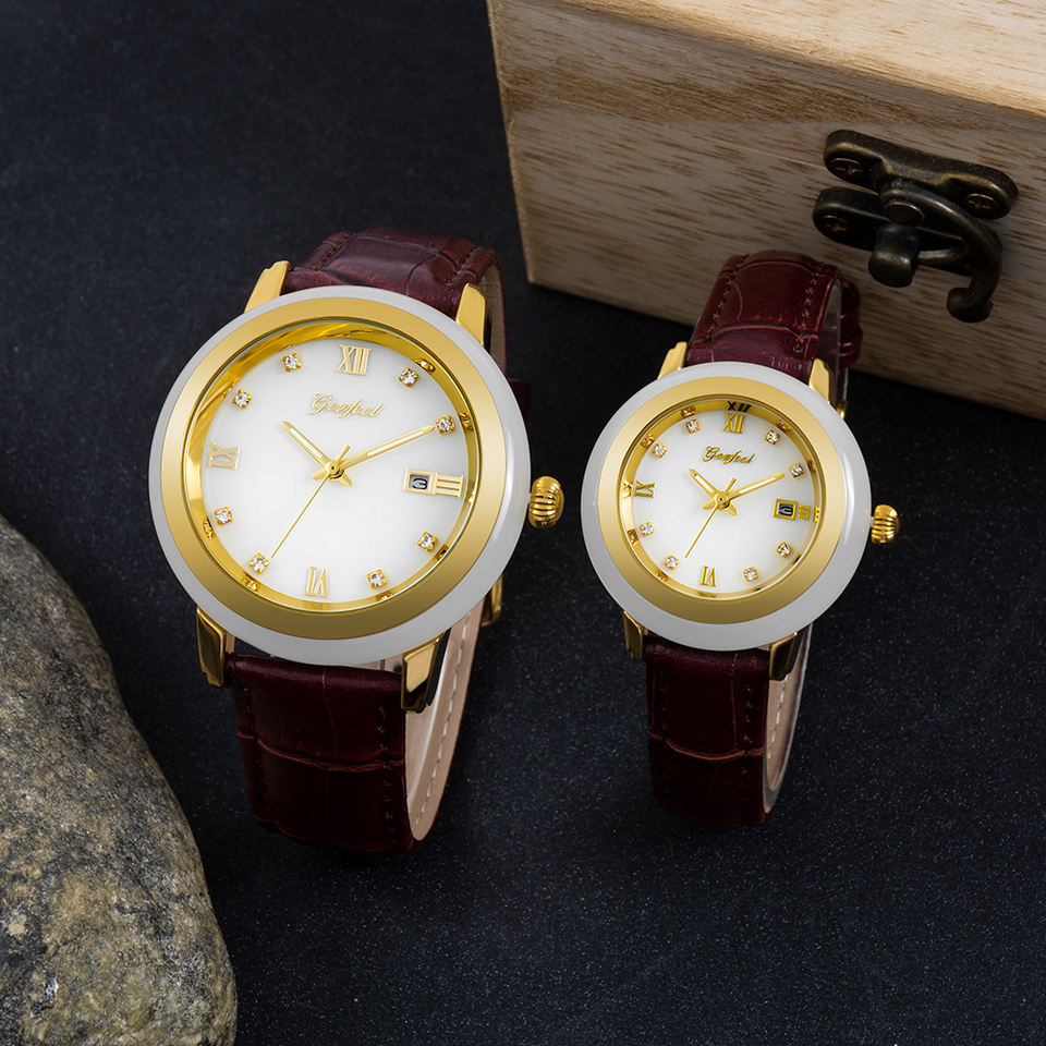 นาฬิกาหยกสังเคราะห์ดีไซน์หรูหราพร้อมตัวเรือนโลหะผสมทองคำ ตัวบอกเวลาประดับเพชร และสายหนัง PU สีน้ำตาล – นาฬิกาผู้หญิง Miyota Quartz