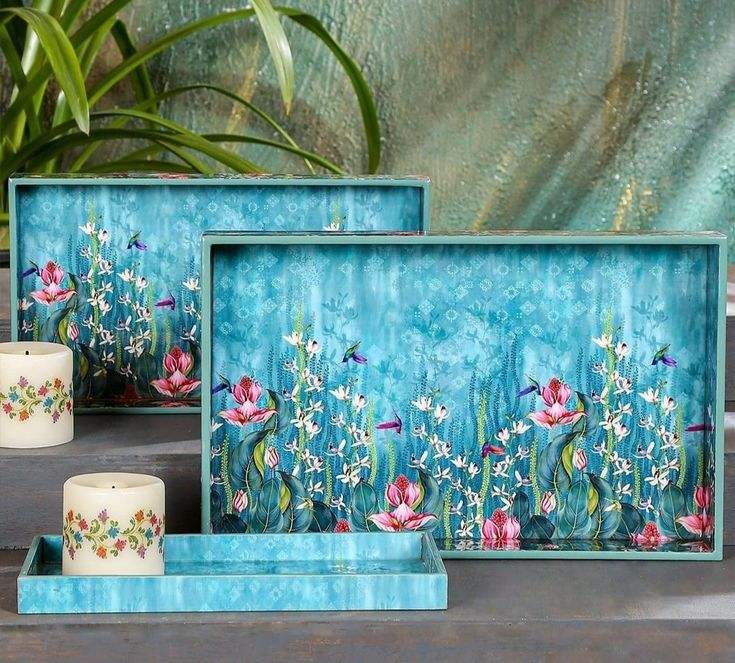 ชุดถาดเสิร์ฟไม้ลายดอกไม้สีเขียวอมฟ้าสุดหรู พร้อมถาดรองรูปทรงสี่เหลี่ยมผืนผ้าลายดอกลิลลี่สีชมพูและลายนก สำหรับตกแต่งโต๊ะอาหารที่บ้าน