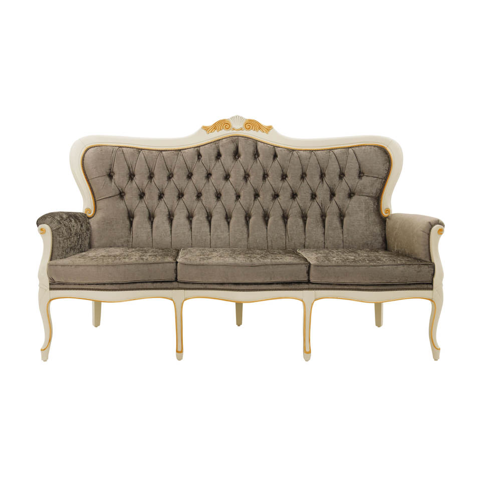 โซฟาแบบดั้งเดิมหรูหรามีรายละเอียดที่แกะสลักด้วยมือด้านหลังเป็นกระจุกสูงเบาะกำมะหยี่นุ่มและขาไม้ที่ได้รับแรงบันดาลใจจากฝรั่งเศส
