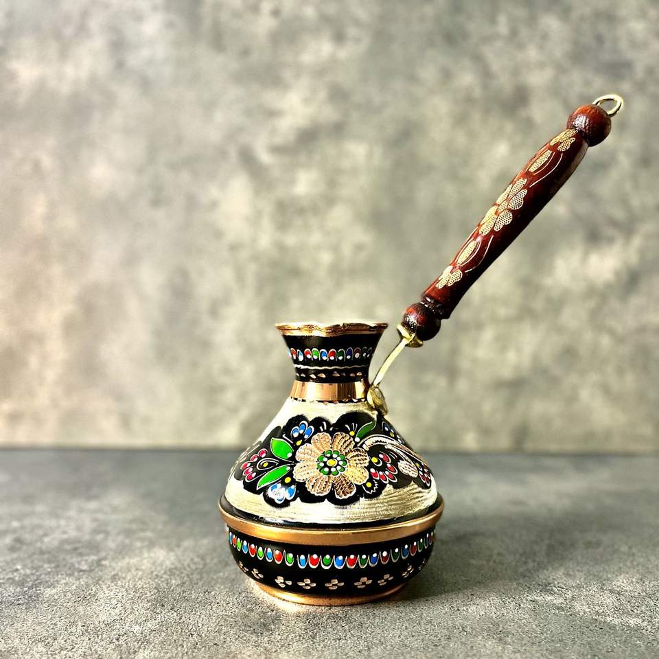 เครื่องชงกาแฟตุรกีแบบดั้งเดิมที่สวยงาม โดดเด่นด้วยดีไซน์โลหะตกแต่งแบบ Cezve และด้ามจับไม้ยาวเพื่อการชงบนเตาอย่างปลอดภัย