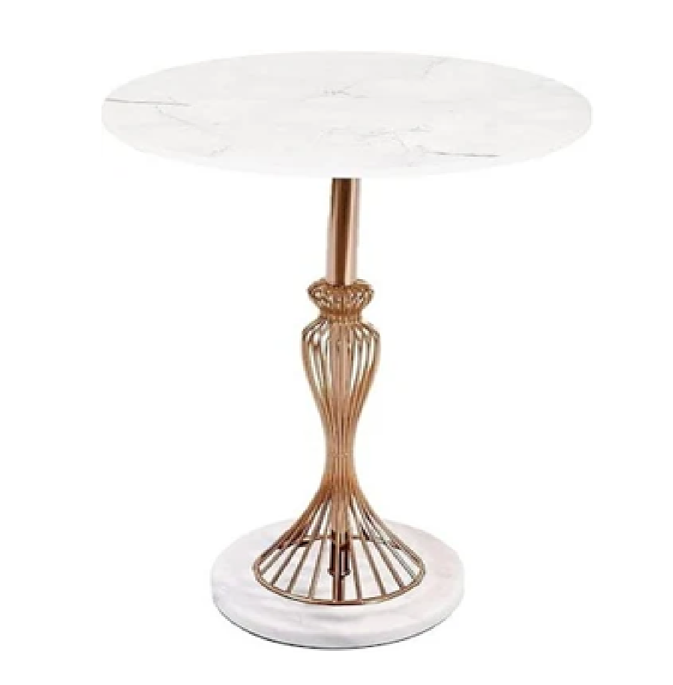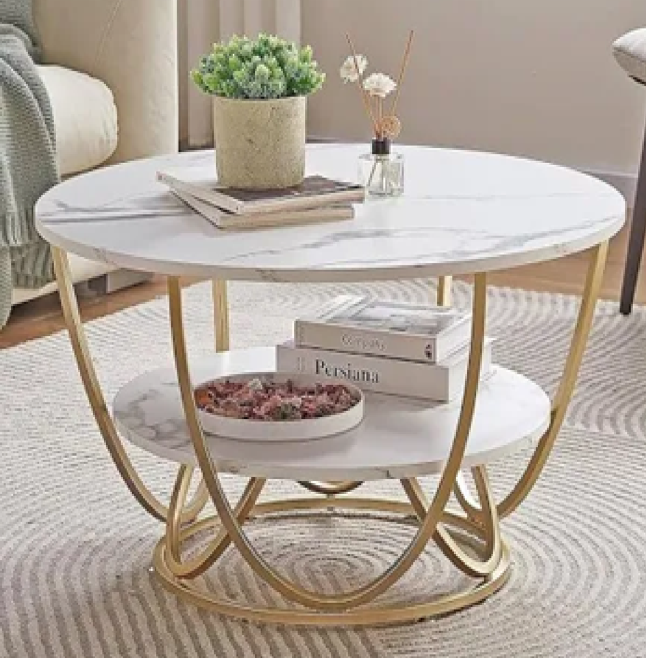 โต๊ะกาแฟสองชั้นที่หรูหราพร้อมด้วยหินอ่อนสีขาวทรงกลมพร้อมฐานโลหะสีทองโค้งตกแต่งขายส่ง