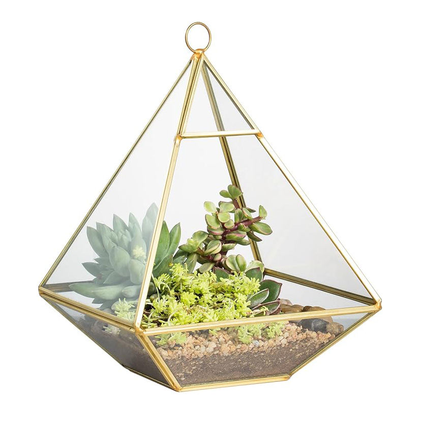 กล่องสามเหลี่ยมทรงพีระมิดทำจากแก้วทองเหลืองแนววินเทจหรูหรากล่องโชว์แบบ Curio กล่องเทอราเรียม | แจกันแก้วคริสตัลทองเหลืองสำหรับงานแต่งงาน