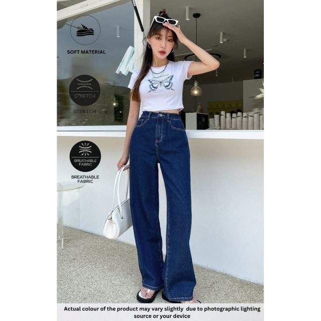 Fit Type: Wide Leg / Loose Fit., Waist Type: High Waist., Fabric: Stretch Denim (Cotton + Stretch Denim)., Length: Full Length (Approx. 40 inches)., Pattern Type: Solid / Plain., Pocket Type: 5-Pocket Classic Design., Stitching: Double-Needle Durable Stitch., Details: Clean Look / Minimalist Finish / Premium Thread Work., Fabric Features: Breathable., Wash Type: Enzyme Wash / Soft Finish., Usage: Casual Wear.