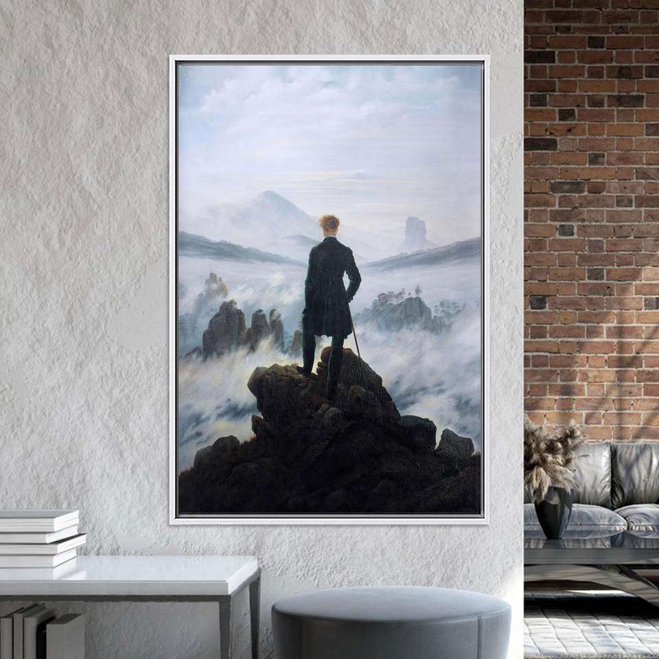ภาพพิมพ์บนผ้าใบลาย "นักเดินทางผู้สง่างามเหนือทะเลหมอก" พร้อมกรอบสีขาว