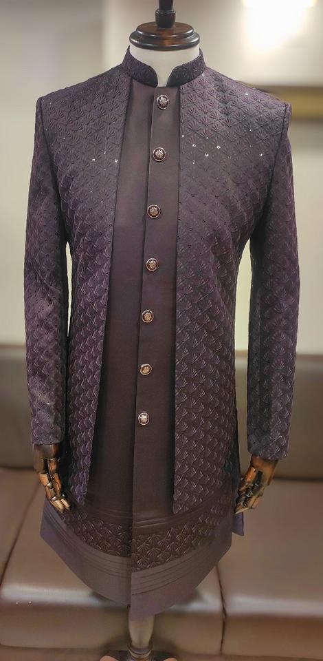 ชุดแต่งงานที่สง่างามสำหรับผู้ชายทำจากโพลีเอสเตอร์ที่มีแจ็คเก็ตปักสไตล์เปิดและจับคู่ kurta