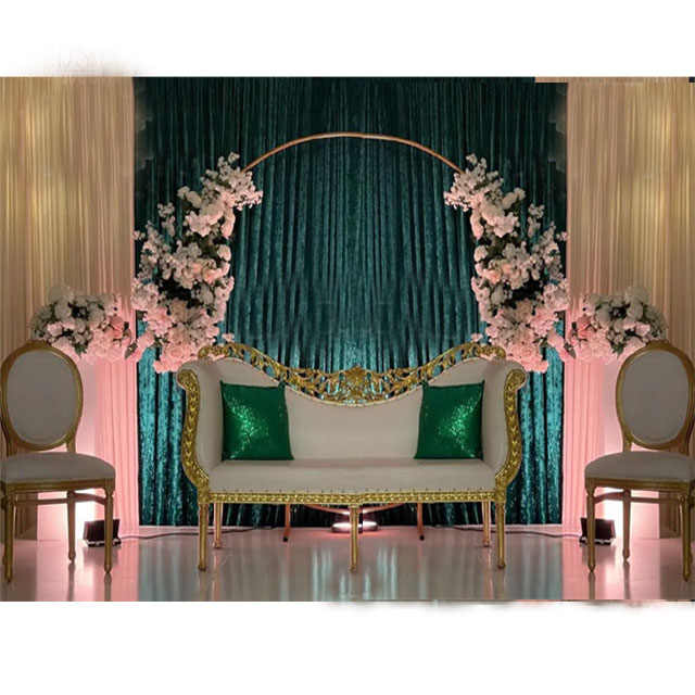 โซฟาไม้สำหรับงานแต่งงานสุดหรูสำหรับเจ้าบ่าวเจ้าสาว ชุดโซฟาคลาสสิกสำหรับเวทีงานหมั้น ชุดโซฟาแต่งงานสีขาวทองสุดหรู สไตล์สเปน