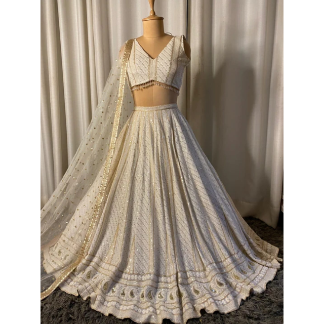 ชุดเลเฮนกาโชลีสีขาวสุดหรู พร้อมงานปักทอง ผ้าฝ้าย สำหรับงานปาร์ตี้และงานหมั้นแบบดั้งเดิมสำหรับเด็กผู้หญิง