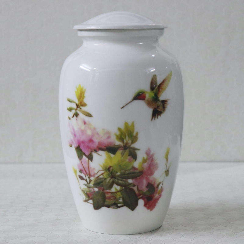 โกศบรรจุอัฐิเซรามิกสีขาวสุดหรู พร้อมลวดลายนกฮัมมิงเบิร์ดและดอกไม้ สำหรับจัดแสดงเพื่อการระลึกอย่างสงบสุข