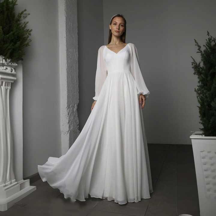 ชื่อผลิตภัณฑ์:ชุดเดรสยาวผ้าชีฟองสีขาวหรูหราแขนพองยาว