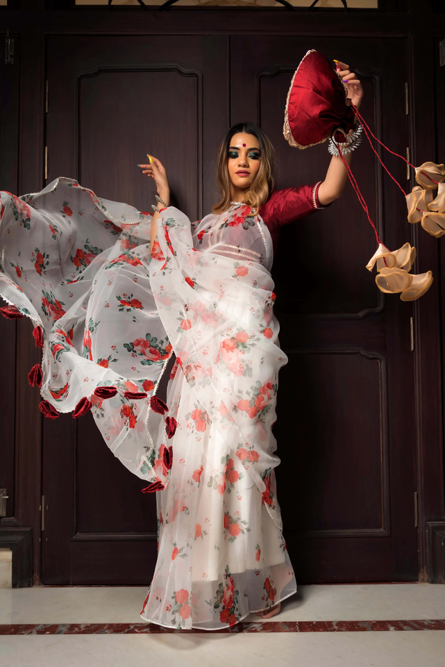 ผ้าส่าหรีออร์แกนซ่าสีขาวลายดอกไม้สุดหรู พร้อมพู่ห้อยสีแดงลายกุหลาบสุดเก๋ และดีไซน์น้ำหนักเบา เหมาะสำหรับงานปาร์ตี้และงานเฉลิมฉลอง