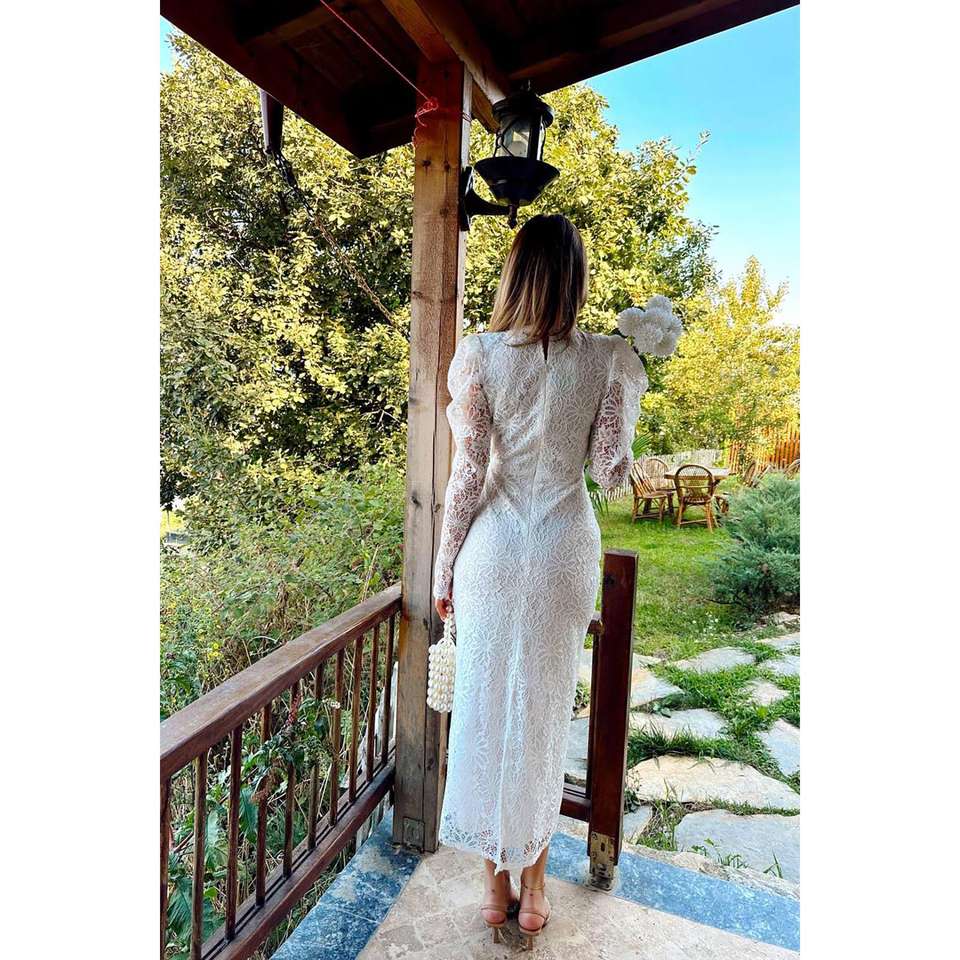 ชุดเดรสลูกไม้สีขาวหรูหราพร้อมแขนพอง คอตัก เอวธรรมชาติ ชุดแต่งงานสไตล์วินเทจ
