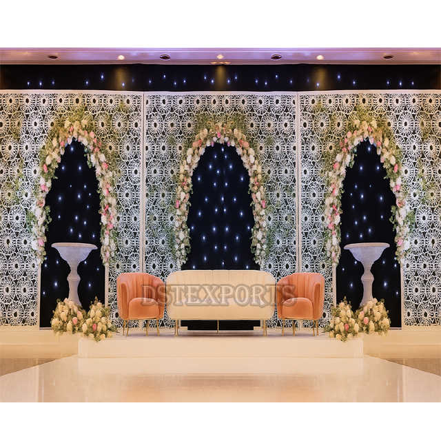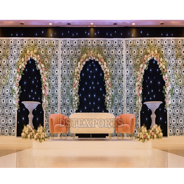 กรอบโค้งตัดด้วยเลเซอร์สีขาวหรูหราสำหรับงานแต่งงานสไตล์อังกฤษแผงฉากหลังโลหะแกะสลักสูงปรับแต่งได้ตามต้องการสำหรับงานแต่งงานในอังกฤษ