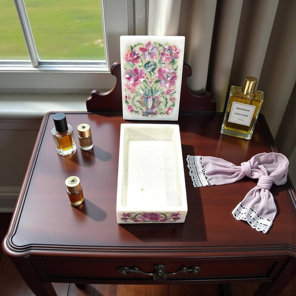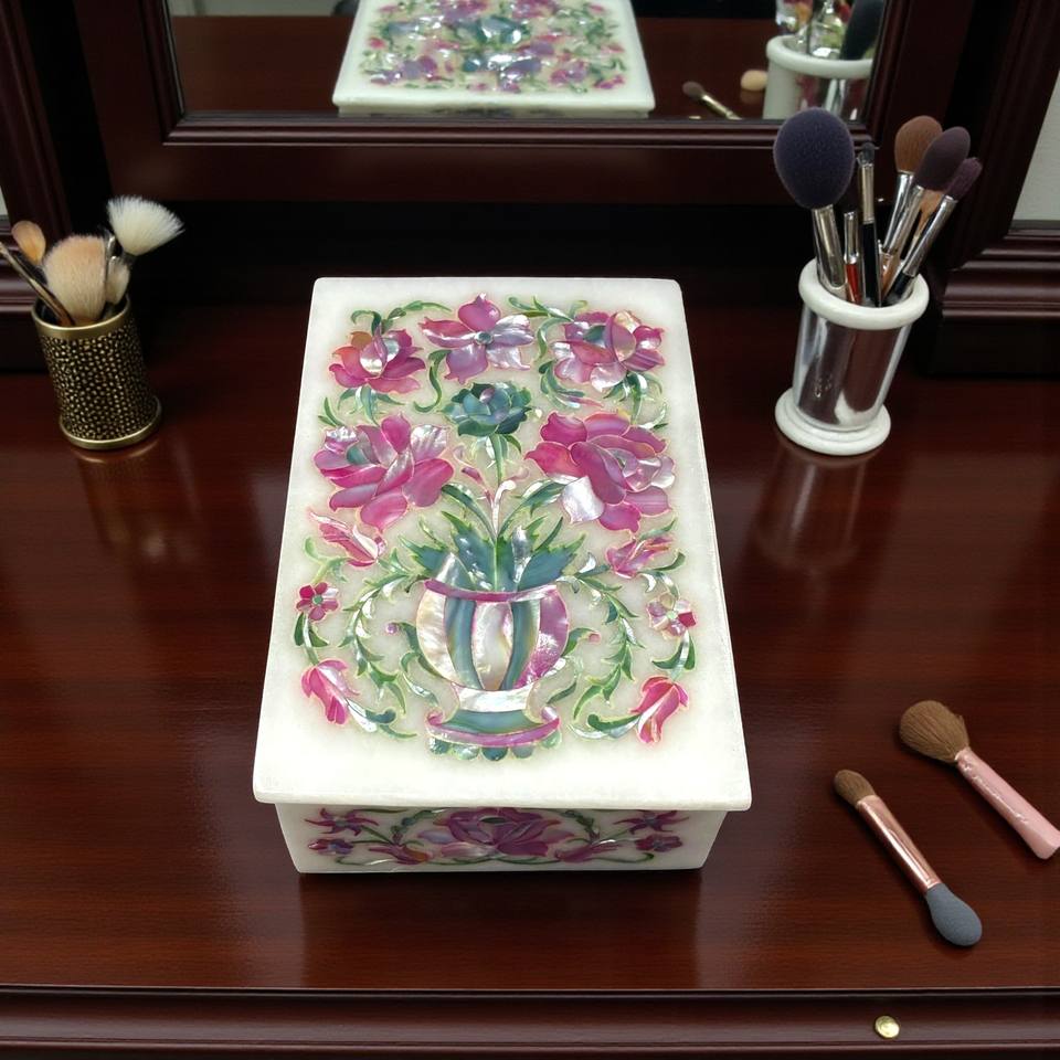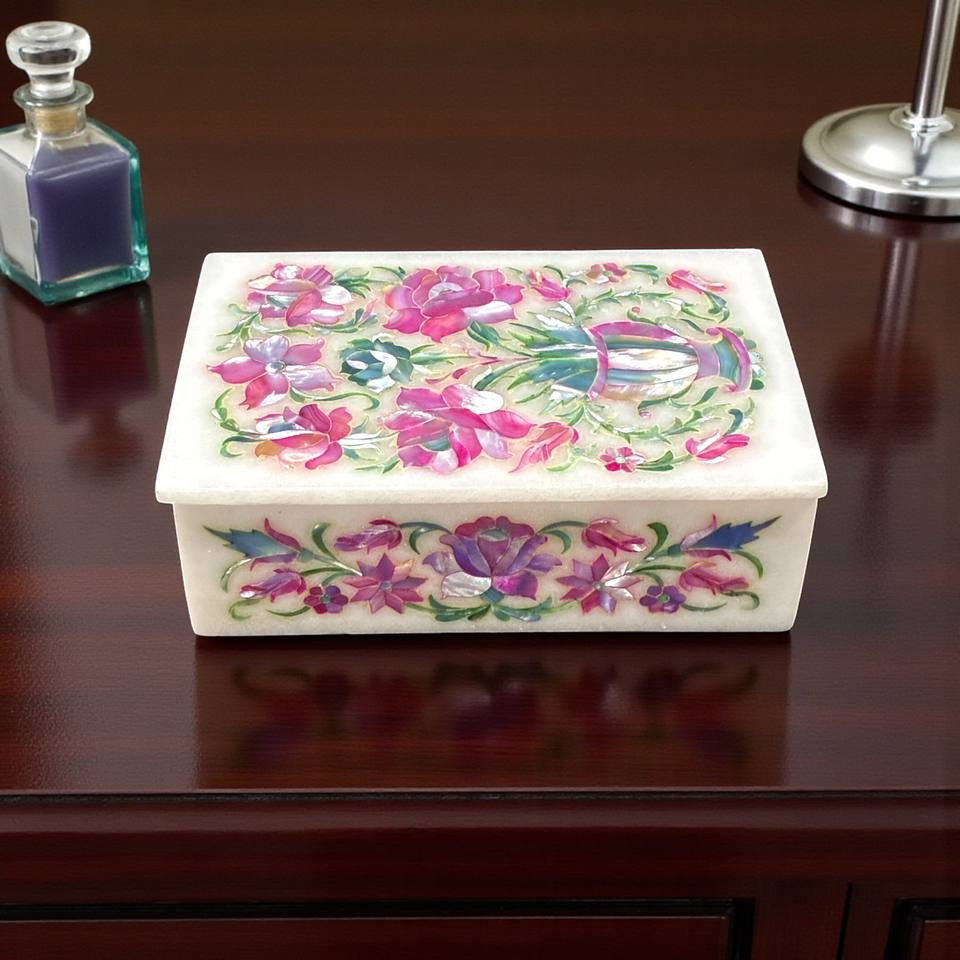 กล่องเครื่องประดับหินอ่อนสีขาวสง่างามงานหัตถกรรมลายดอกไม้แม่ของไข่มุกฝังหินของขวัญคริสต์มาสสำหรับเขา/เธอ