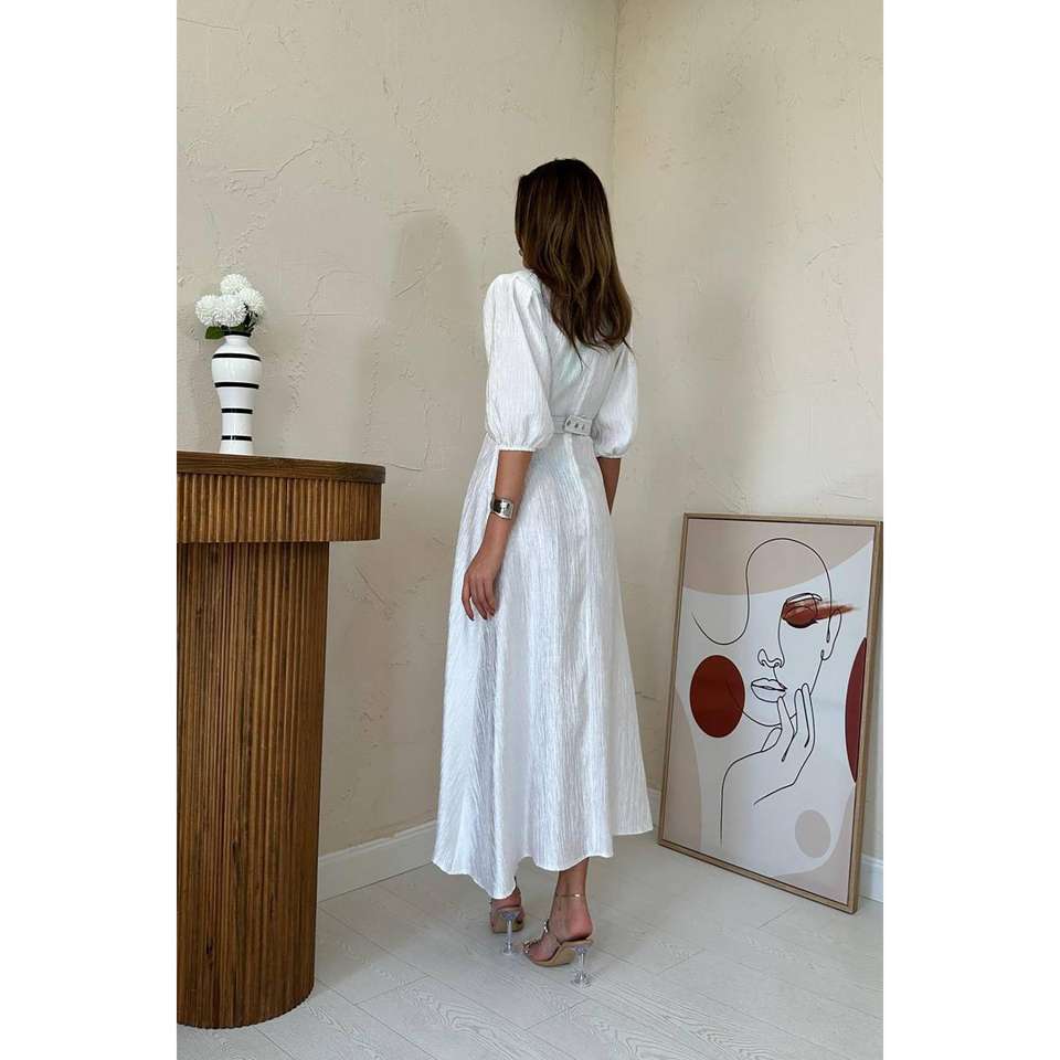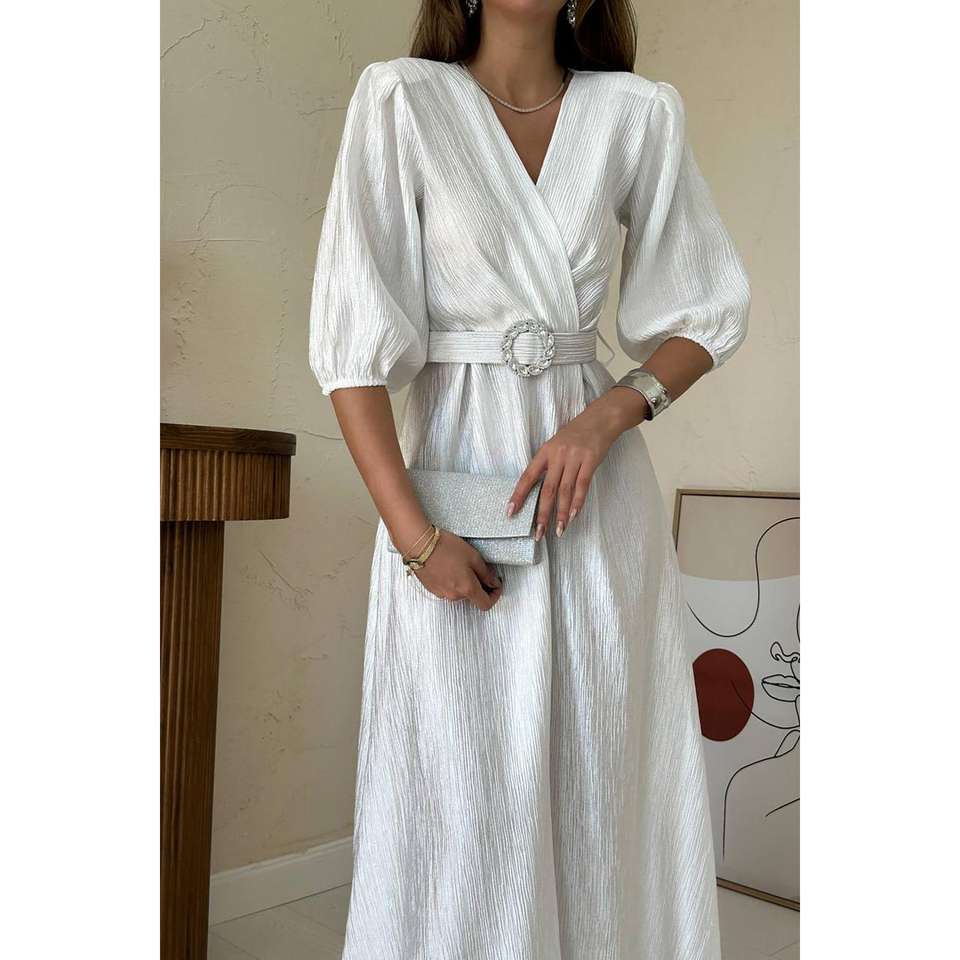 เดรสผ้าทอลายวิบวับสีขาวหรูหรา ทรงเอ คอวี พร้อมเข็มขัด สวมใส่สบายๆ สำหรับทุกวัน