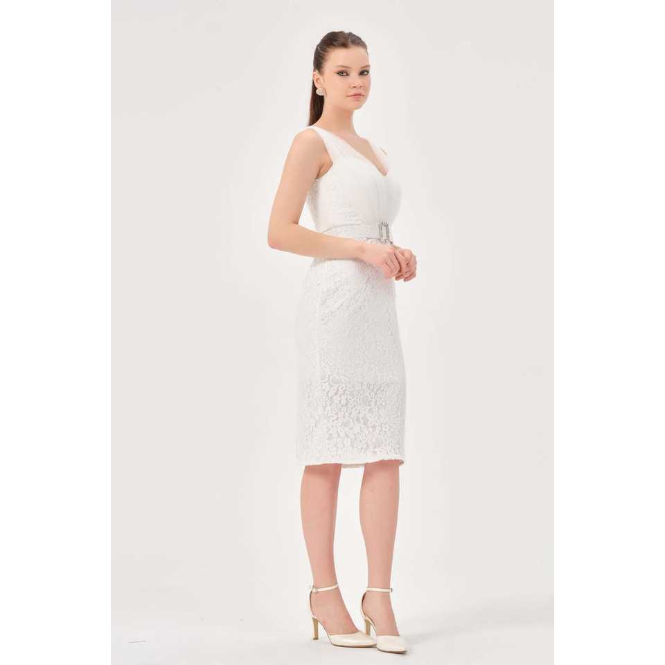 ชุดราตรีสีขาวคอวีทรงเข้ารูป ผ้าออร์แกนซ่า พร้อมดีไซน์เอวธรรมชาติ เหมาะสำหรับงานพิธีการ