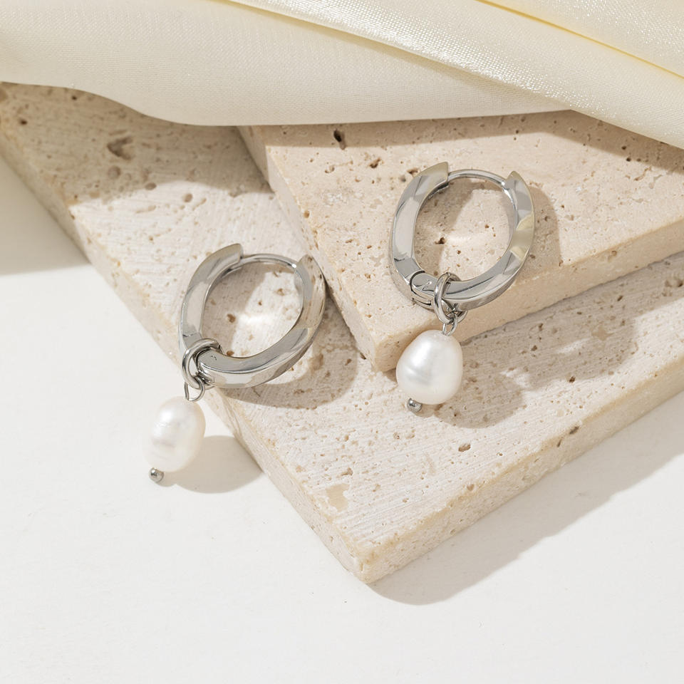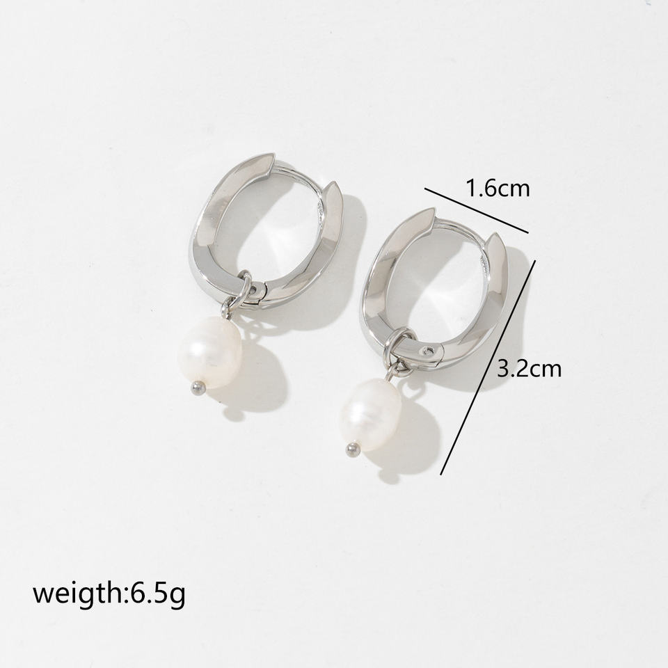 ต่างหูห่วงสแตนเลสรูปทรงเรขาคณิตสีเงินกันน้ำสไตล์ผู้หญิงที่สง่างามต่างหูห่วงมุก