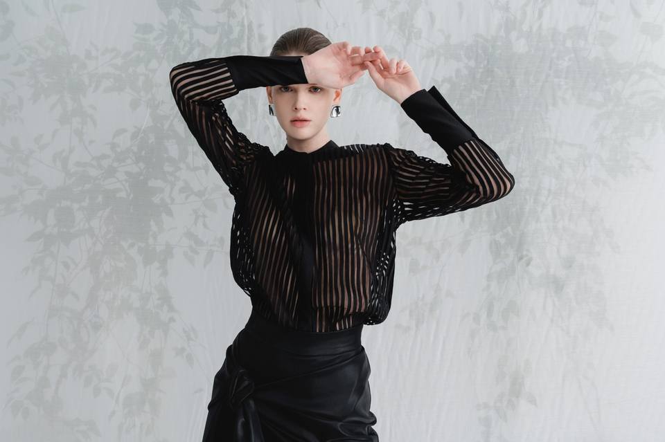 เสื้อเบลาส์และเสื้อเชิ้ตผู้หญิงสุดหรู สีดำและสีขาว เสื้อเบลาส์แขนยาว ALIDA ผ้าคุณภาพคิวโปร ป้ายกำกับสั่งทำ ขาว ANT เวียดนาม