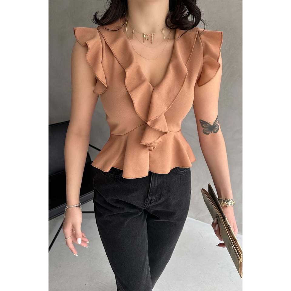 เสื้อชีฟองผู้หญิงหรูหรา แขนกุด คอระบาย ทรงเปปลัม ใส่ได้ทุกวัน สีฟ้า